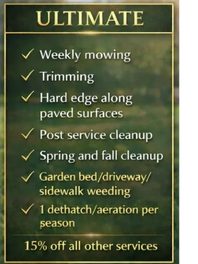 Ultimate package is designed for the homeowner that wants to set their property apart from the rest of the neighborhood. Weekly cuts with sharp mower blades, trim the full property, hard edge/stick edge the boarders and leave no blade of grass out of place. Spring and Fall cleanups keep things neat and tidy and decrease risk of disease and improve overall turf and bed health. Your choice of dethatching or aeration included in the package and once the lawn is looking perfect, we shift our attention to unwanted weeds in driveway cracks, garden beds and everywhere they're not supposed to be. Save 15% on all other Mowtivation services and projects as an Elite customer.